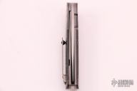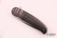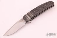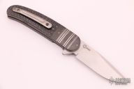This LL06 flipper by Herucus Blomerus features a hand rubbed, satin finished blade with notched flipper. The handle has fluted zirconium bolsters, carbon fiber scales with bead blast finish titanium liners with jimped spine, stainless steel backspacer and a tip up milled titanium clip. Blade is centered when closed, nice detent and lockup. Very smooth flipping action, rides on Ceramic IKBS. Comes with zipper case. Excellent condition.