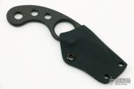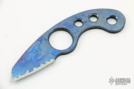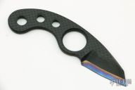 This La Griffe is "Fingerprint" anodized titanium with a chisel ground blade with a carbide edge adan carbon fiber laminate, .220" thickness and 1.180" blade depth, 1" diameter finger hole. Nice fit in the hand. Excellent condition. Comes with kydex neck sheath. Marked "P1" on blade.