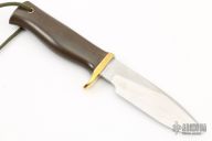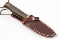 The Model 28 by Randall Made Knives is an excellent skinning and outdoors knife. Has a satin finished drop point blade with false top edge and notched thumbrest, stainless steel blade, .157" blade stock and 1.125" blade depth, full tang construction. The handle has a brass guard, green linen micarta handle and a lanyard hole at the butt. Comes with brown leather sheath. Excellent condition.