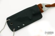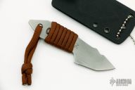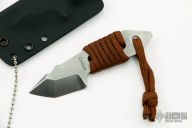 This Imp by Peter Atwood features a bead blasted chisel ground tanto blade with notched thumbrest, .131" blade stock and .938" blade depth. The handle has rubber cord wrap, prybar at the butt with lanyard hole. Comes with kydex neck sheath and ball chain. Comes with original card. Excellent condition.
