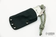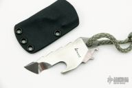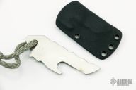 S30V steel with Peter's Area 51 textured finish.The tanto style cutting edge is approximately 9/19 inch. Overall 3 1/8 inch x 1 inch x 1/8 inch thick. Partially scalloped spine. Ideal for tackle boxes, tool boxes, pocket carry. Let your imagination come up with how many ways you can use the Pop N Chop. Kydex sheath.