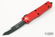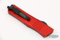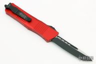 This Troodon automatic by Microtech knives features a black blade with fullers. The handle has a red aluminum frame with thumb-slide and glass breaker, and tip down clip. Comes with original box and papers. Dated 10/2021 with a S/N of 8618. Excellent condition.