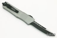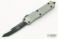 This Troodon automatic by Microtech knives features a black tanto blade with fuller. The handle has a gray titanium frame with thumb-slide and glass breaker, and tip down clip. Comes with original box and papers. Dated 07/2021 with a S/N of 7914. Excellent condition.