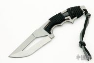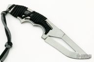 This POGN-L by Bawidamann Blades features a stonewash blade with a false top edge, notched thumbrest and fileworked spine, .163" blade stock and 1.553" blade depth, full tang construction. The handle has contoured black cord weap. Comes with a kydex sheath. Excellent condition.