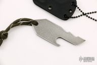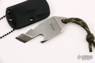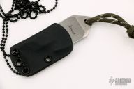 S30V steel with Peter's raw bar finish.The tanto style cutting edge is approximately 9/19 inch. Overall 3 1/8 inch x 1 inch x 1/8 inch thick. Partially scalloped spine. Ideal for tackle boxes, tool boxes, pocket carry. Let your imagination come up with how many ways you can use the Pop N Chop. Comes with Kydex sheath and COA. Excellent condition.