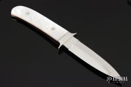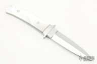 This Dagger by John Young features a mirror finished double-edged blade, .176" blade stock and .909" blade depth, full tapered tang construction. The handle has mirror polished stainless steel guard, beautiful mother of pearl scales with red liners. Comes with a brown leather sheath. Excellent condition.