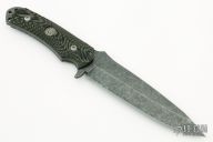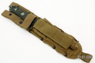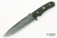 This Hide Fighter by Steve Woods and Wilson Combat features a MoARK Black finished blade with a fuller on one side, .200" black stock and 1.606" blade depth, full tang construction. The handle has black/green G-10 scales. Comes with a Spec-Ops Sheath. New from maker!