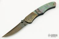 The knife features an upswept blade crafted "Santa Ana" patterned nitre blue Damascus. The thumbstud is fileworked with a citrine inset. The handle is comprised of dovetailed "Santa Ana" pattern nitre blued Damascus and presentation grade mother of pearl scales over 15N20 carbon steel liners that have been stippled and nitre blued. The backbar features meticulous chevron pattern engraving and all pins have been fileworked. A gorgeous piece. Silky smooth action. Like new, Excellent+ condition. Includes velcro case.