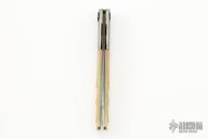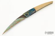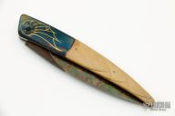 This "Bertie Lock" folder by Bertie Rietveld features a bolster tilt locking mechanism. The bolsters blued stainless steel with gold inlaid engraving. Scales are carved mammoth ivory, titanium liners and stainless steel backspacer. The blade is "DragonSkin" Damascus carved and colored. Makers mark is found in the looking glass in the pivot, very cool. Includes a zippered case. Excellent condition.