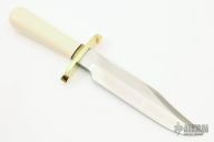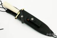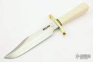 This Model 14 CDT by Randall Made Knives features a clip point satin finished stainless steel blade, .230" blade stock. 1.403" blade depth. Sharpened top edge. Nickel silver double lugged guard, Resin Ivory grip with black spacers. Cut Down hidden tang. This knife was designed to meet the demand for an almost indestructible all-purpose knife, though it is especially suited for combat and survival purposes. Comes with a black leather sheath and a zippered case. Excellent condition.
