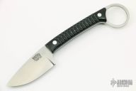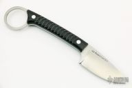 This Ring Tail by Bark River Knives features a satin finished drop point blade, .125" blade stock and .975" blade depth, full tang construction. The handle has black canvas micarta scales and a ring at the butt. Comes with a brown leather sheath (that may or may not fit this knife) and original box. Has a couple light scuffs, otherwise excellent condition.