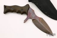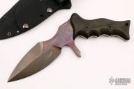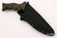 This Custom UUK was designed by Laci Szabo and executed by Robert Newton, .276" blade thickness and 1.867" blade depth, double edged titanium blade with full tang construction. Nicely contoured black linen micarta handle scales. The UUK, or Urban Utility Knife is the most well-known of Laci Szabo's designs. Comes with a kydex sheath with belt loop. One mean field-tested tactical. Unused, excellent condition.