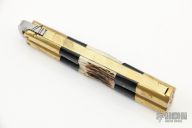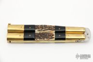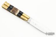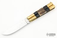 This balisong from the Philippines features a drop point blade with a mirror polished blade.  The handle has brass bolsters, stag scales, brass T-latch. Oxidation is visible on the blade.  Scuffs and scratches are visible on the blade and handle.