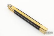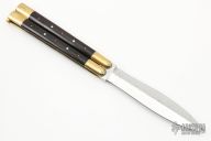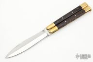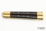 This Balisong features a satin finished spear point blade. The handle has brass bolsters and liners with wood scales and a brass t-latch. Has some oxidation and patina.