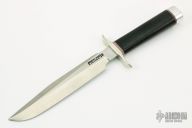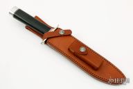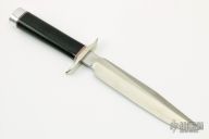 This Model 1-7 from Randall Made Knives features a satin finished clip point blade with sharpened top edge, .226" blade stock and 1.157" blade depth, hidden tang construction. The handle is comprised of a nickel silver guard, black/duralumin spacers, black linen micarta handle and duralumin pommel. Comes with brown leather sheath. New from maker.