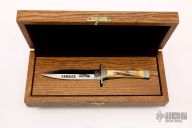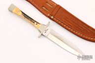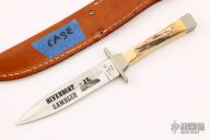 This Riverboat Gambler by Case Knives features a double edged satin finished blade with .106" blade stock and .872" blade depth, full tang construction. The handle has a nickel silver guard and pommel with stag scales. Includes a wooden presentation box. Comes with a brown leather Case sheath, not original but fits nicely. Has a few light scratches, otherwise excellent condition.