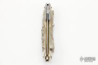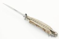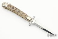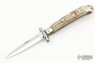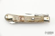 This swing guard auto features a dagger style blade with a single nail nick. The handle has nickel silver bolsters over brass liners and stag scales. Excellent Condition.