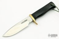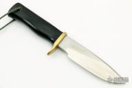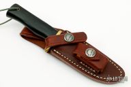 This Miniature model 28 features a satin finished drop point blade with notched thumbrest, .163" blade stock and .904" blade depth, full tang construction. The handle has a brass guard, black micarta grip and lanyard hole. Each miniature Randall model has a transponder in the handle matching the serial number of the knife, in this case "RKS 597/1171". Comes with brown leather sheath. Excellent condition.