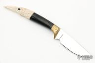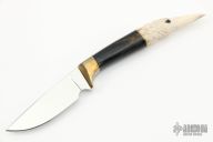 This knife features a mirror polished drop point blade with a hidden tang construction. .130" Blade Stock. .8993" Blade Depth. The handle brass bolsters a buffalo horn and carved bone grip. Excellent Condition.