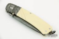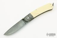 This lockback by Barry Davis features a drop point Damascus blade with fileworked spine, Damascus thumbstud with a brass pin. The handle has fluted and fileworked Damascus bolsters, fluted mammoth ivory scales, domed pins and lanyard bail, fileworked nickel silver liners, fileworked stainless steel lockbar and backspacer. Nice lockup and blade seating, very smooth. Excellent condition. Comes with a zippered case.