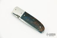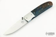 This Model 3 by Andre Van Heerden features a hand rub satin finished blade with single thumbstud and a fileworked thumbrest. The handle has textured titanium bolsters, burl wood scales, anodized titanium liners, fileworked stainless steel backspacer. Comes with a zippered case. Excellent condition. Dated 2004