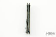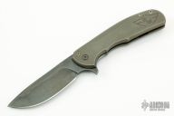 This Ferox by Ferrum Forge features a tumble finished blade with acid etching that looks like a hamon, has flipper. The handle has an anodized and tumble finished titanium frame with blue anodized tip up clip and barrel spacers. Features internal over travel arrestor in the stainless steel lockbar insert. Nice detent, lockup and blade seating. Included with the knife is a zippered case and original Dogtag. Has a couple of scratches, otherwise excellent condition.