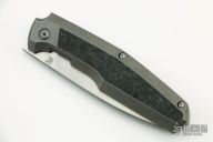 This linerlock was designed by Philippe Jourget and manufactured by CKF. This knife features a hand rub satin finished drop point blade with a filed thumbrest. The handle is composed of titanium with carbon fiber inlay. Titanium tip up pocket clip and backbar. Includes a padded Velcro case, COA and extra hardware. Has a couple light scuffs/scratches, otherwise excellent condition.