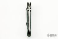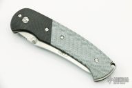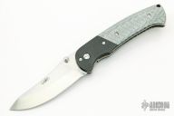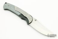 This ADV linerlock features a hand rub satin finished blade with notched thumbrest and dual thumbstuds. The handle has carbon fiber bolsters, silver twill scales, satin titanium liners and tip down clip. Smooth action with a nice detent, lockup and blade seating. Excellent condition.