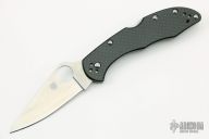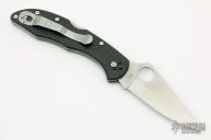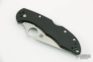 This Delica 4 by Spyderco has a satin finished blade with thumbhole opener and notched thumbrest, blade is HAP40 with SUS410 Clading. The handle has carbon fiber scales and a 4-way reversible stainless clip. Comes with original box and papers. Blade favors the right side slightly. Excellent condition.