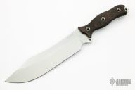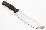 This Chop House by Busse Knives features a satin finished blade, .219" blade stock and 2.114" blade depth, full tang construction. The handle black canvas micarta scales. Has a few light scratches, otherwise excellent condition.