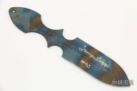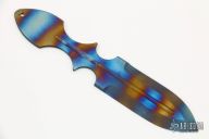 This knife is one piece construction of titanium. Has been heat colored. Chisel ground double edged blade, .097" blade stock and 1.198" blade depth. Has fullers on both sides on the blade. Signed "Tanya Begg" on B-side of blade and #45. Has a few light scuffs, excellent condition.