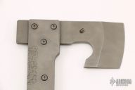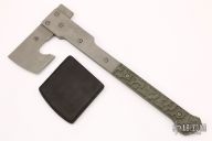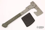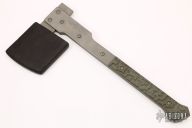 This One off Tomahawk by Jens Anso features a bead blasted chisel ground blade with .265" blade stock. The handle has bead blasted titanium plates on either side of the blade and a titanium tang, green G-10 scales. Comes with a black leather sheath. Has a few light scratches, otherwise excellent condition.