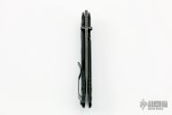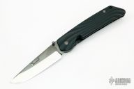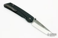 "The blade is ground on both sides in the tradition of the highly praised Japanese sword. This shape is both sharp and strong, and can still slice paper even after the 1,000 of hemp rope cuts. Using this blade form is one superb method of making an edge thick without losing of its sharpness. This is a knife of preeminent sharpness. You can enjoy its strong cutting capabilities for a long time. Even if used for rigorous cutting, the blade will not bite thanks to its convex shape. Other knives often will bite, and may nick if it is pulled out suddenly at that time. This knife scratches the plate of china. Please do not use it to cut food on the plate." The blade is two-tone black/mirror, the handle is sculpted black aluminum and tip up black stainless steel clip. Excellent condition. #116 on blade. Comes with original box and papers. This is an early one!