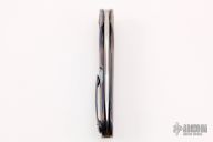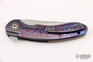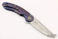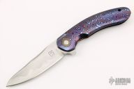 This AWT framelock flipper by Brad Southard features a hand rub satin finished blade with hamon and a flipper. The handle has a mokuti frame and tip up clip with an orange peel finished and anodized titanium backspacer. Smooth flipper opening that requires no wrist action, rides on IKBS. Nice detent, blade seating and lockup. Excellent condition. Comes with a velcro case.