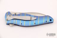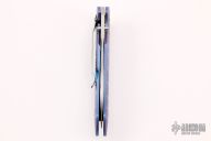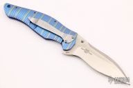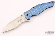 This Bump 1590BL (#0768) assisted opening flipper by Kershaw has a satin finished S30V stainless steel spear point blade with dual thumb studs. Handle is fluted blue with gold striped aluminum, tip down stainless steel clip, and lanyard hole. Comes with padded zipper case and original box. Has a couple of scuffs but otherwise in excellent condition.