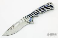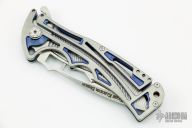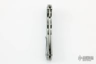 The Nirk Tighe design by Brian Tighe and Glenn Klecker won Blade Magazine's "Most Innovative Design" award for 2010. This flipper by Brian Tighe features a milled satin finish blade and a machined skeletonized titanium frame with anodized reliefs. The knife uses Glenn Klecker's lockback mechanism - pressing the base of the spine will release the lock. Excellent condition.  #3