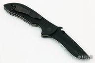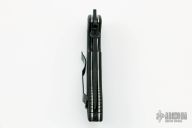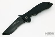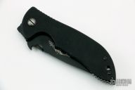 This Mini Commander from Emerson features a black recurve partially serrated blade with notched thumbrest, thumbhole and wave feature. The handle has black G-10 scales, titanium liners, black G-10 backspacer, and a tip up black stainless steel clip. Nice detent, lockup and blade seating. Has some scuffs and wear on the blade, otherwise good condition. Dated 2004 and s/n 2825.