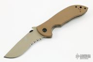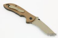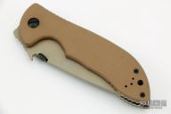"This is the Emerson Commander. It has the "wave shaped feature" and is just as formidable as its full sized father. Strong as a Bull Moose and tough as nails. The Commander features our Patented "wave shaped opening feature" or Remote Pocket Opener. In an emergency or injury situation the knife can be opened with one hand as it is drawn from the pocket." This knife has a tan coated blade, tan G-10 scales, titanium liners and a tan tip up stainless steel clip. Includes a Velcro case. Excellent condition.