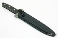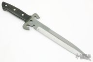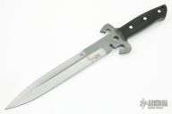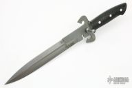 This custom Crossada was designed by Master at Arms James Keating and made by Dozier Knives. Has a bead blasted and satin finished double edged bayonet ground blade, .223" blade stock and 1.520" blade depth, full tang construction with black linen micarta scales and aluminum pins and lanyard hole. Comes with removable stainless steel quillions. Comes with a kydex sheath and a zippered case. Excellent condition.