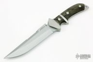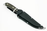 This knife by Halligan and Son features a bead blasted blade with sharpened top edge and serrations, .244" blade stock and 1.497" blade depth, full tapered tang construction. The handle has stainless steel guard and sub-hilt with green/black linen micarta scales. Comes with a kydex sheath and zippered case. Has a couple light scuffs, otherwise excellent condition.