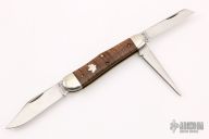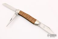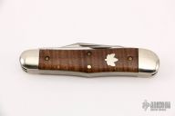 This Stockyard Whittler from Great Eastern Cutlery features three satin finish blades. One large clip point, one sheepsfoot and one small awl blade all with nail nicks. The handle is comprised of nickel silver front/rear bolsters and curly maple covers with nickel silver escutcheon over brass liners and steel backsprings. Includes original packaging. Some minor scuffs on blade and bolsters, but overall great condition.