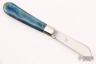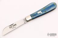 This Swayback by Great Eastern Cutlery features satin finished wharncliffe blade with nail nick. The handle has pinched and polished nickel silver bolsters, Royal Blue Camel Bone covers with a nickel silver boot escutcheon, brass pins and liners, stainless steel spring. Has half-stop. Comes with original tube. Excellent condition.