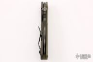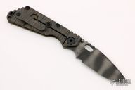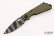 This Mick Strider SNG framelock folder features a tiger stripe blade with thumbhole and notched thumbrest. The handle has a green G-10 and flamed titanium frame with titanium clip, tip up carry. Jimping on blade spine. Nice lockup, and blade seating. New condition.
