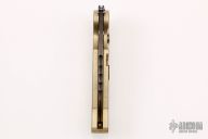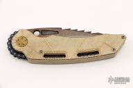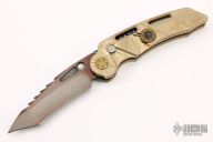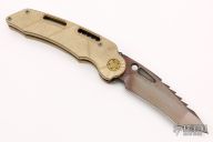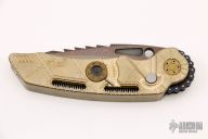 This MRX Nautilus by Guardian Tactical/Rat Worx features a Damascus tanto recurve blade. The handle has an aluminum bronze frame with steam punk style milling pattern, port holes to view the springs, open and closable port hole. #0027 inside the frame. Lanyard hole at the butt. Excellent condition. Comes with original box, zippered case and COA.