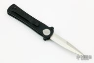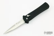 This is a push button single action automatic by S.W.A.T. with single edge spearpoint blade with satin finish. T6 black aluminum handle with push button and swinging safety. Excellent condition.