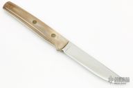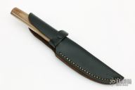 This hunter by Pabu Knives features a polished drop point blade, .087" blade stock and .843" blade depth, full tang construction. The handle has mammoth ivory scales. Comes with a black leather sheath. Has a few light scratches, otherwise excellent condition.