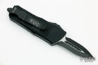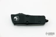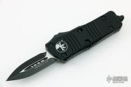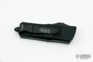 This Troodon Mini OTF automatic by Microtech knives features a black double edged blade, and a black aluminum handle with black hardware, tip down stainless steel carry. Glass breaker. S/N 4486. Dated 03/2022. Comes with original box. New condition.