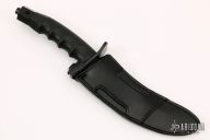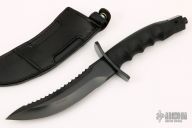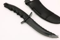 This Black Warrior from Al Mar Knives features a black coated blade with serrated top edge, .236" blade stock and 1.484" blade depth, hidden tang construction. The handle has a black stainless steel double guard, black rubberized handle, and a black stainless steel butt. Comes with original black leather sheath and box. Excellent condition.
