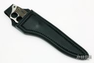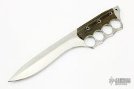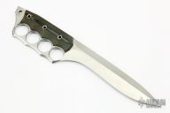 This Crowd Pleaser by Mark Terrell features a double edged satin finished blade, .210" blade stock and 1.875" blade depth. Full tang construction with black/green linen micarta scales, knuckle guard grip and skull crusher with lanyard hole. Holes are 1" in diameter with smooth beveled edges. Feels great in hand. Includes a black leather sheath by Paul Long. Excellent condition. This knife is sterile with no markings.