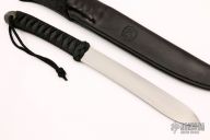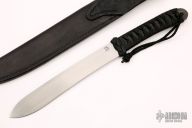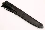 This Bolo by Michael Burch features a hand rub satin finished blade with hamon, you probably won't be able to see it in the pictures because it is faint, .189" blade stock and 1.335" blade depth. The handle has black cord wrap over black leather/skin. Comes with a black leather sheath. Excellent condition.